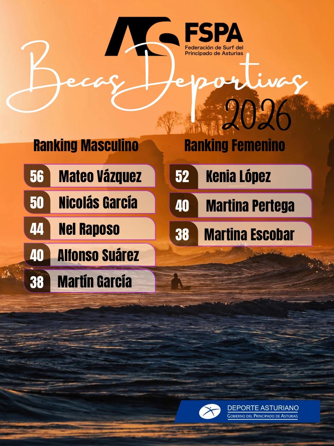 La Federación de surf del Principado de Asturias anuncia con orgullo a las personas becadas en 2026. Cada una de ellas recibirá una ayuda de 400 €, que se abonará durante la próxima semana.